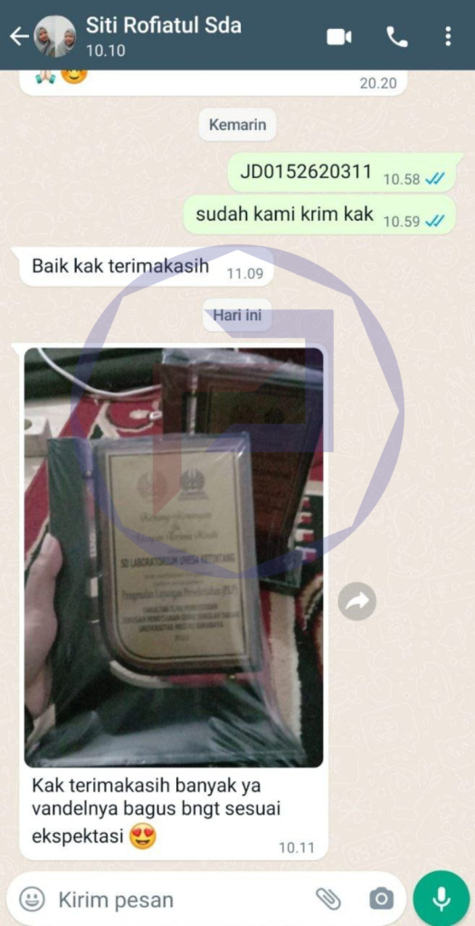 Hubungi Kami untuk pemesanan sekarang juga! Jangan lewatkan kesempatan untuk memiliki plakat yang memancarkan kemewahan dan penghargaan dalam setiap momen istimewa Anda.
